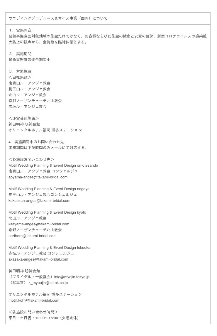 ご結婚式を控えていらっしゃる新郎様新婦様におかれましては、ご不便をお掛けしてしまい誠に申し訳ございませんが、ご不安なことがございましたら誠心誠意対応させていただきますので各お問い合わせ先までご連絡くださいませ。