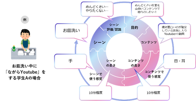 このモデルは、“ながら行動”を行う際に「シーン/目的/コンテンツ」の3要素を上記のようなドーナツ型のパズルがはまるように無意識的に決定しているという、Z世代特有の”ながら行動”様式を構造的に示したものです。
