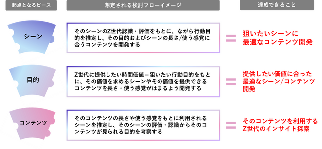 この「ドーナツパズルモデル」は1つのピースを起点にした際の最適な体験設計を検討する際に活用でき、「あるシーンにおける最適なコンテンツ設計」や「Z世代の行動目的に寄り添ったシーン開発/コンテンツ開発」など対Z世代の体験設計の道標になると考えています。