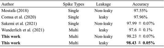 2層のSNNを用いた場合のMNISTデータセットにおける認識性能。Spike Typeについては、Singleは各ニューロンあたり最大一回の発火制約 (TTFSコーディング)を表し、Multiは複数回発火が可能な場合を表す。