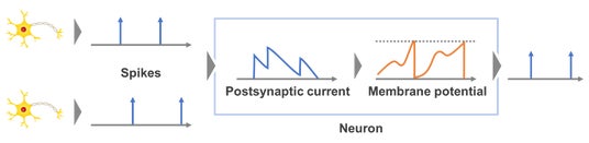 隠れ層を一層持つ学習後のSNNの時間発展を示している。最上段の図は発火時刻に符号化された入力スパイクの時刻をプロットしている。上から2番目の図は、ある隠れ層ニューロンの膜電位(橙色実線)とシナプス電流(青色破線)の時間発展を示している。ニューロンは発火後もシナプス電流を保存し、複数回発火している。上から3番目の図は、複数の隠れ層ニューロンの膜電位の時間発展を示している。最下段の図は、出力層ニューロンの膜電位の時間発展を示しており、処理終了時刻(この場合t=1.0)の各出力層ニューロンの膜電位を出力値としている。このモデルでは、出力層が発火しないことに留意されたい。