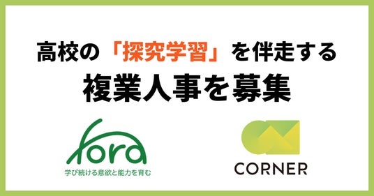 株式会社コーナー(所在地:東京都渋谷区 代表取締役:門馬 貴裕、以下コーナー)は、一般社団法人Fora(所在地:東京都中央区 代表理事:藤村 琢己、以下Fora)と協業し、高校の探究学習支援を伴走する複業人事を募集します。