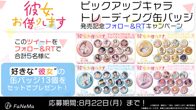 「『彼女、お借りします』ピックアップキャラトレーディング缶バッジ」の発売を記念して、Twitterフォロー&リツイートキャンペーンを実施いたします。