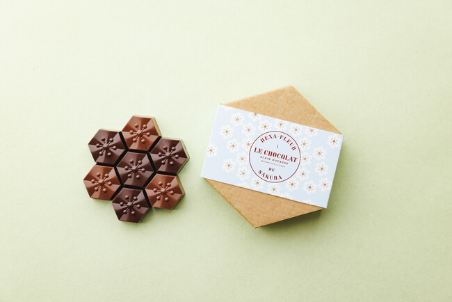 サクラをモチーフにした春の限定商品。オリジナルブレンドの75%ショコラノワールとマダガスカル産45%ショコラ オ・レの二種の詰め合わせ。グリオット(サクランボのシロップ漬け)のピュレをショコラと組み合わせた甘酸っぱいガナッシュと、桜の葉の風味をほんのり効かせたアーモンドプラリネの2層仕立てです。