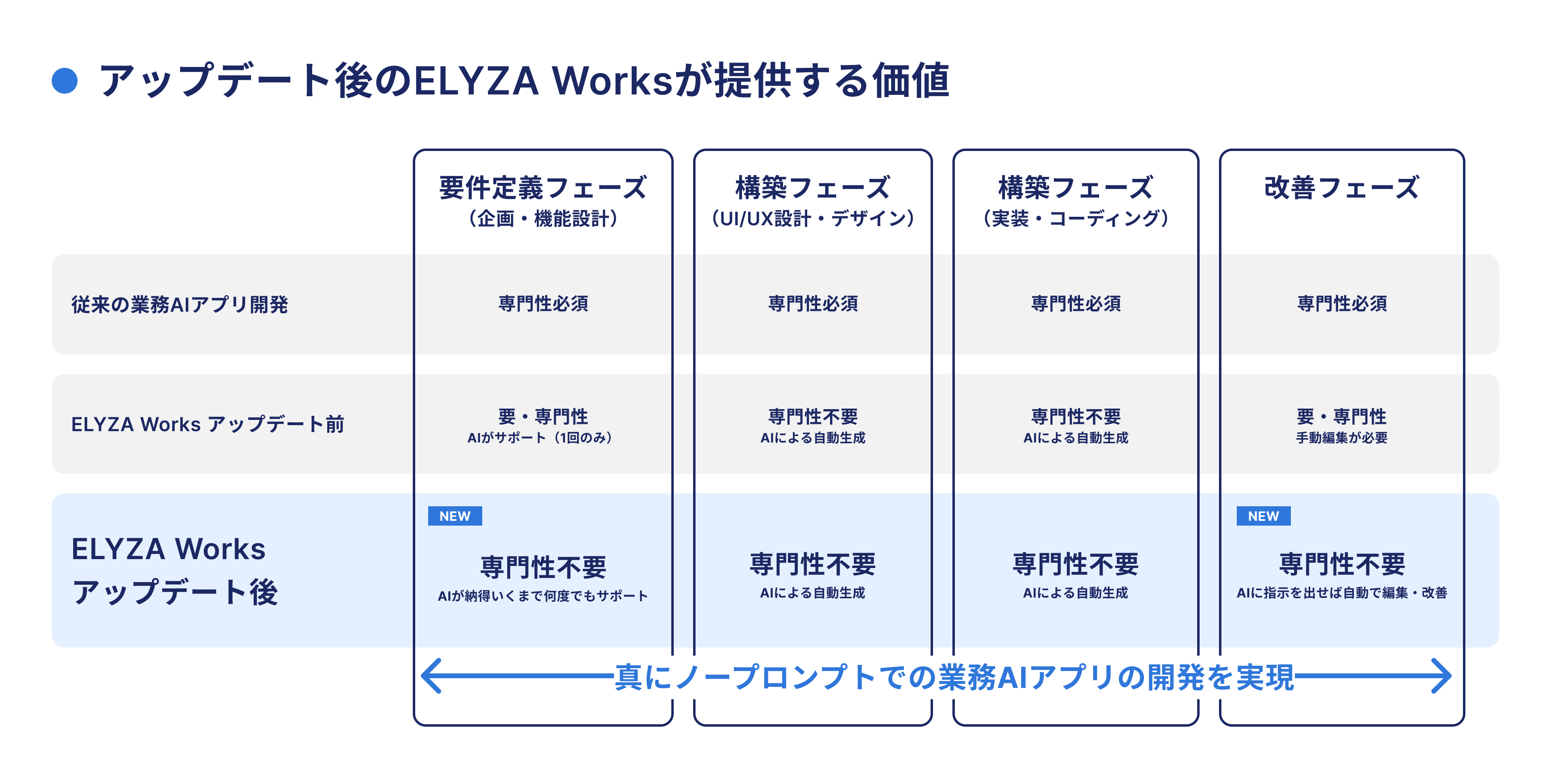 今回の機能追加により、ELYZA Worksは、要件定義から作成、チームでの共有・利用、改善に至るまで、業務AIアプリ開発の全行程において、AIのフルサポートを享受できるサービスに進化し、ユーザー視点では「真にノープロンプトでの業務AIアプリ開発が可能なサービス」となりました。
