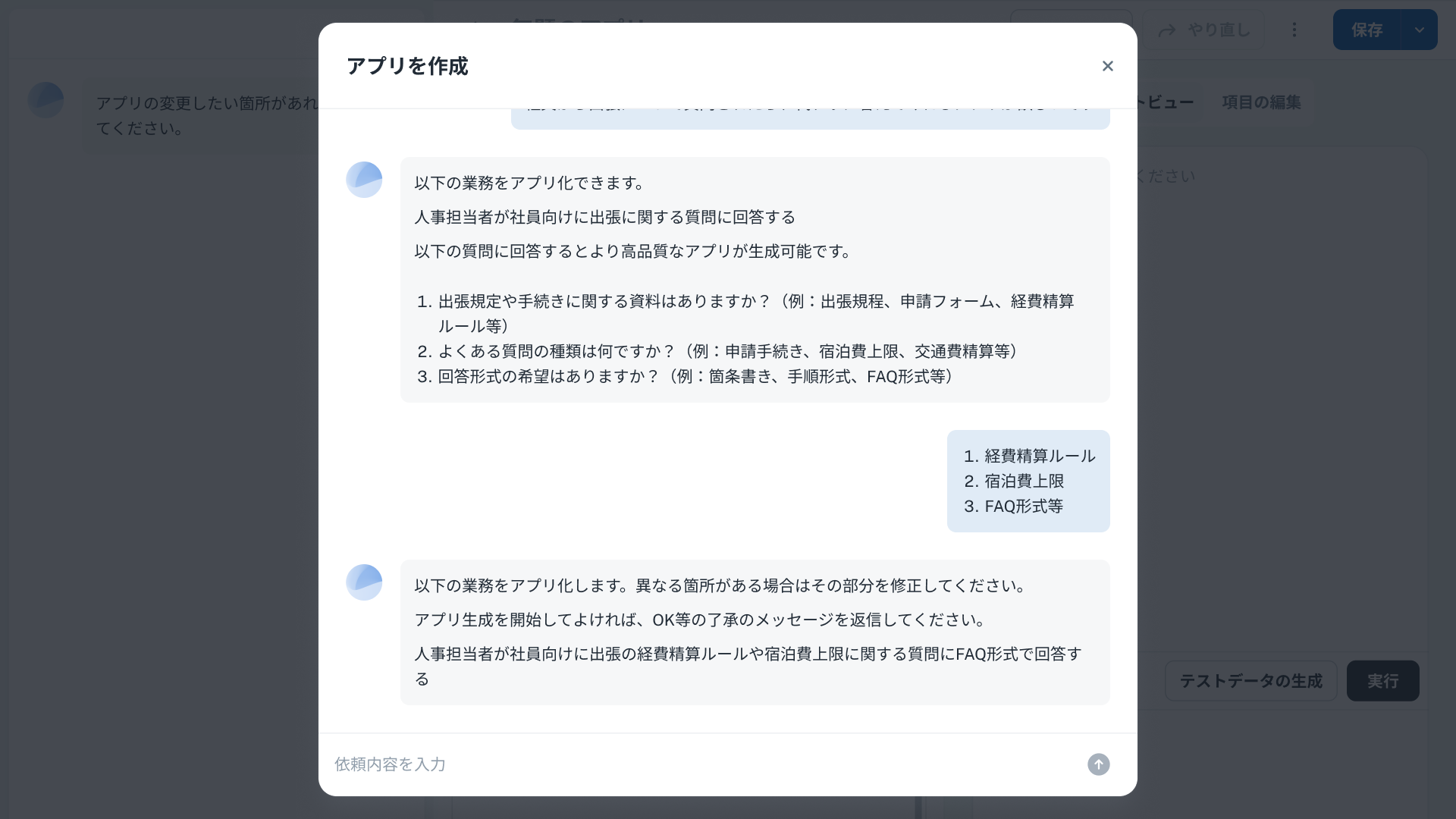 本機能に対して作りたいアプリの内容を相談すると、アプリ化に必要な要件の言語化を支援する質問と提案が提示され、回答や選択をしていくことで、プロンプト知識不要でアプリ要件を精緻化することができます。