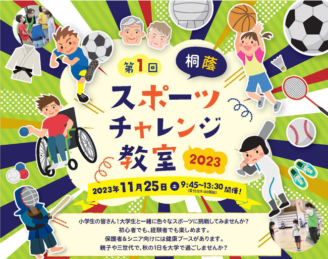 桐蔭横浜大学(横浜市、学長:森朋子)は、11月25日(土)「第1回桐蔭スポーツチャレンジ教室2023」を開催(後援:横浜市青葉区)。小学生(事前予約要、参加費500円)及び保護者・シニア対象(事前予約不要、参加費無料)に実施。サッカー、野球、バスケットボール、剣道、柔道、バドミントン、陸上、パラスポーツなどの競技を体験でき、将来のプロや全国レベルの大学生アスリートから指導を受けることができるプログラム。初心者から経験者まで楽しめ、保護者&シニア向けには健康ブースもある。本学学生である楽天ゴールデンイーグルスドラフト1位指名の古謝 樹選手と川崎フロンターレ加入内定の山内 日向汰選手との撮影会、サッカー最強ディフェンダー「しょうごBOSS」氏による、ドリブル対決も行う。