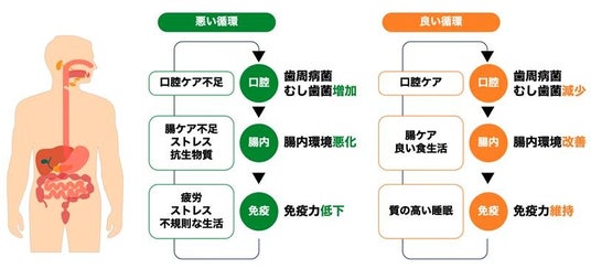 口内と腸内は密接に関係しており、「口腸相関」という考え方が注目されています。口腔ケアが不足すると、歯周病菌やむし歯菌が増加し、それらが腸内環境を悪化させることで免疫力の低下に繋がり、さらに疲労やストレスが溜まりやすくなってしまう、という悪循環を引き起こしてしまいます。悪循環を断ち切り、良い循環を生み出すためには、正しい口腔ケアを行うことが重要です。