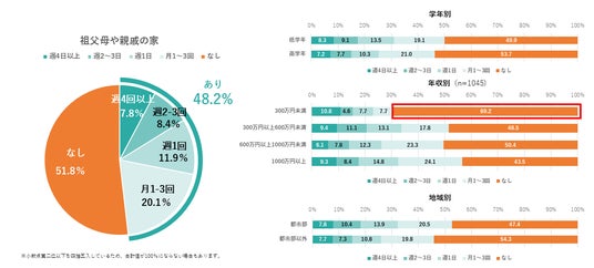 また、「祖父母や親戚の家で過ごす」割合は全体で48.2%であり、年収別に見ると、300万円未満で69.2%がなしと回答し、他と比べると著しく多い結果になりました。