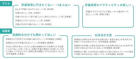 さらに子どもたちの声を聴いてみると、学童保育に対する不満の声が多くあがりました。長期休みに学童保育で過ごす割合は全体で43.5%、低学年だと61.0%を占めます。長期休みの長い時間を過ごす学童保育ですが、子どもたちからは「学童に行きたくない」「学童ばかりだとつまらない」などの声がありました。