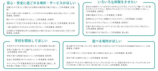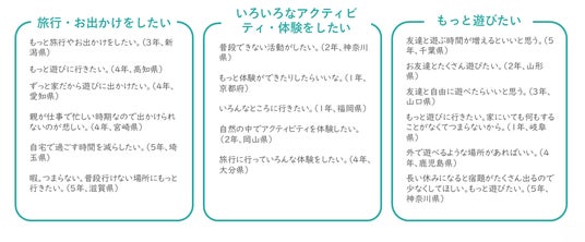 一方、子どもたちに長期休みの過ごし方についてニーズを聞いたところ、「旅行・お出かけがしたい」「いろいろな体験がしたい」「友達ともっと遊びたい」という声が特に多く上がりました。他にも「家族とお出かけしたい/家族と過ごしたい」「家でゆっくりしたい」「自由に過ごしたい」という声も多数あがりました。