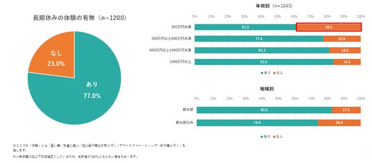 さらに、長期休みに「習い事/友達と遊ぶ/祖父母や親戚の家に行く/サマースクール・キャンプ・旅行等」いずれの体験もない子どもは全体で23.0%、低所得層だと38.5%という結果となり、特に低所得層の子どもは長期休みの体験が少ない状況が浮き彫りとなりました。