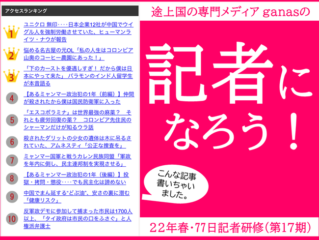 途上国の専門メディア「ganas」(運営:NPO法人開発メディア)は、途上国・国際協力のさまざまな分野を取材し、記事を書く記者を養成するプログラム『77日記者研修』の参加者を募集します。77日間にわたって、ネタの見つけ方から取材方法、記事の書き方までを集中的に学びます。今回が17期目。