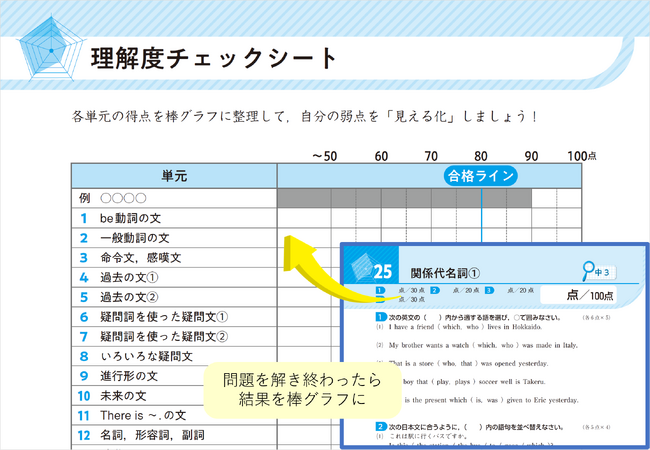 ↑英語の問題ページと「理解度チェックシート」。解き終わった結果を棒グラフにすることで弱点が一目でわかります。