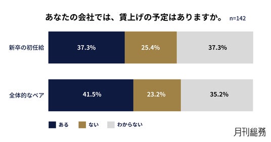 賃上げの予定があるか尋ねたところ、新卒の初任給は37.3%、全体的なベアは41.5%の企業で予定されていることがわかりました(n=142)。