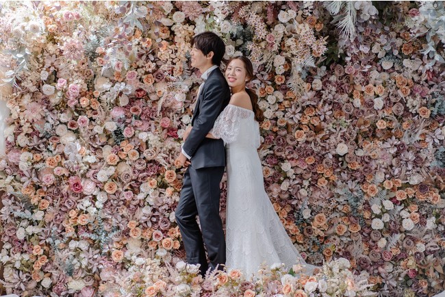たくさんのお花が壁一面に花開く、フラワーウォールスタジオ。スタジオの中でお花畑のような撮影を楽しめます。「ロケ撮影だと日程の都合がつけにくい」「暑い時期は体調が心配」といったおふたりにもおすすめです。