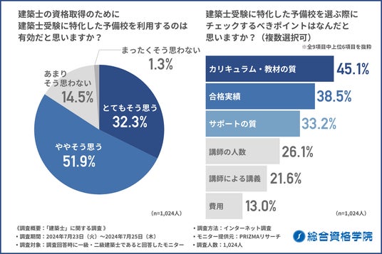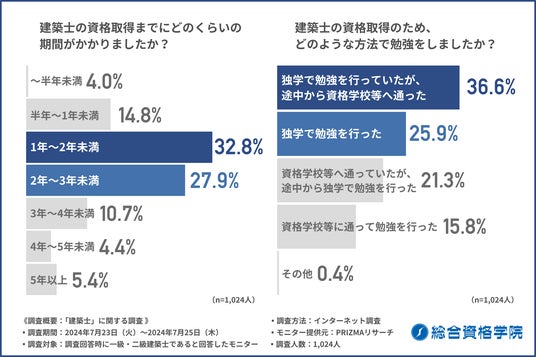 約半数が資格取得に2年以上かかり、8割以上が建築士受験に特化した予備校の利用は有効と回答