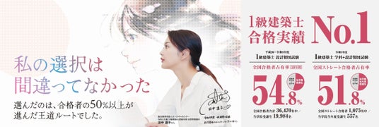 令和5年度1級建築士試験において、学科試験と設計製図試験を1年で突破したストレート合格者(注1)の2人に1人以上(注2)を当学院当年度受講生が占め、「日本一」の合格実績を達成しています。