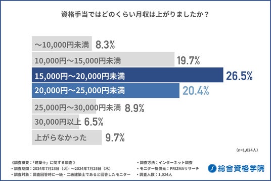 「資格手当ではどのくらい月収は上がりましたか?」と質問したところ、『15,000円~20,000円未満(26.5%)』と回答した方が最も多く、次いで『20,000円~25,000円未満(20.4%)』、『10,000円~15,000円未満(19.7%)』と続きました。