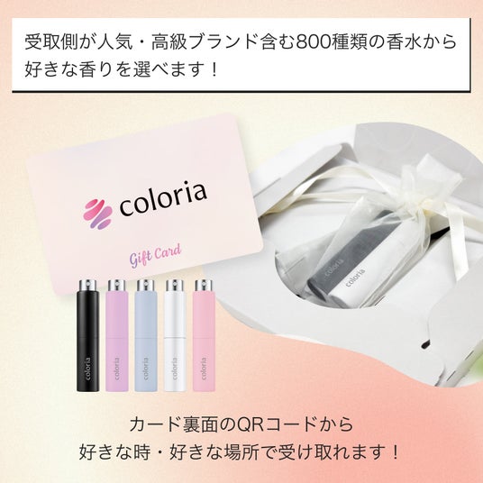 ギフトカード裏面のQRコードより、好きな時・好きな場所でお受け取りが可能です。受け取ったお相手はカラリアにお取り扱いのある約800種類の香水から、お好きな香りをお選びいただけます。ギフトカードはAmazonにてご購入いただけます。