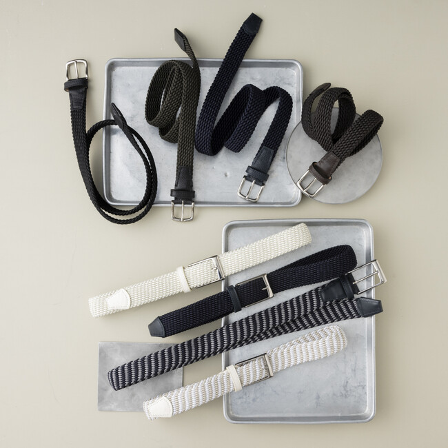 デザインの中心となるメッシュ部分には、イタリアで100年以上続く老舗ベルト帯メーカーの素材を使用。ゴム素材とともに編み込まれていることにより、伸縮性があることはもちろん、しっかりとした厚みと密度が担保されるため耐久性も期待できます。信頼がおける素材を用い、卓越した技術を持つイタリアのベルト職人が手仕事にてフィニッシュすることによりメイドインイタリーを貫くラルコバレーノのアイデンティティとリンクするベルトが仕上がりました。