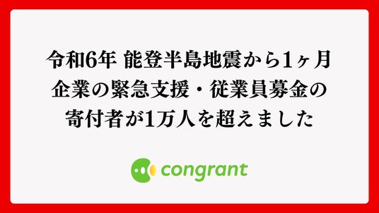 NPO・ソーシャルセクター向け寄付決済システム「congrant(コングラント)」を提供するコングラント株式会社(本社:大阪市西区、代表取締役:佐藤正隆)は、「令和6年 能登半島地震」の発生による甚大な被害に少しでも支援を届けるため、企業が迅速に寄付・募金活動を開始することができる緊急サポートを2024年1月3日より行なっています。このたび企業による緊急支援募金の寄付者が1ヶ月で1万人を超えたことをお知らせします。