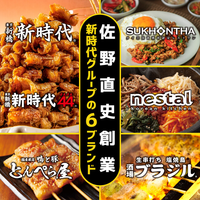 主要ブランド『新時代』の他に、新時代44・とんぺら屋・タイ料理スコンター・韓国料理ネスタル・生串打ち 塩焼鳥 酒場ブラジルと、いくつものブランドを展開します。