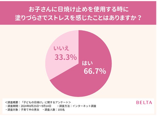 「子どもへ日焼け止めを塗る際に、塗りづらさでストレスを感じたことはありますか?」という質問に対しては66.7%が「(ストレスを感じたことが)ある」と回答しました。