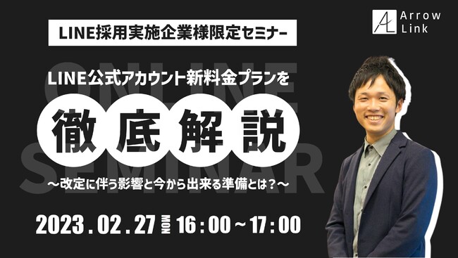 株式会社アローリンク(本社:兵庫県神戸市、代表取締役:蓬莱和真)は、2023/02/27(月)にLINE採用実施企業様限定で無料のオンラインセミナーを開催します。「LINE公式アカウント新料金プランを徹底解説! ~改定に伴う影響と今から出来る準備とは?~」と題し、LINE公式アカウントの新料金プランならびに今後の運用方法について詳しくお伝えします。