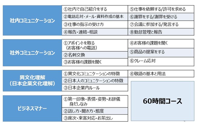 社内でのコミュニケーション上必要な日本語力の強化、社外のお客様のやりとりに必要な日本語力の強化、基礎的な異文化理解、ビジネスマナーを学習するコースです。