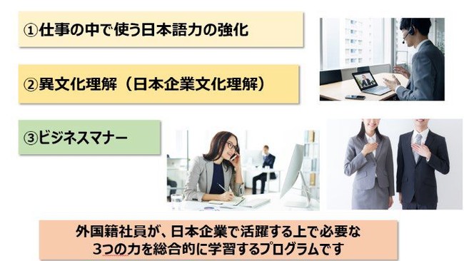 当教育プログラムは、外国人社員が日本企業内に入社し、早期に活躍していく上で必要な『日本語教育』『異文化理解(日本企業文化理解)』『ビジネスマナー』が総合的に学習できる教育プログラムです。入社後の日本語スキルのギャップや、『知識不足』からくる外国人社員と日本人社員のミスコミュニケーションを解消することを目的としています。