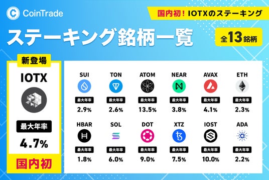 株式会社マーキュリー(本社:東京都渋谷区 代表取締役社長:都木 聡、以下、「当社」)は、当社の提供するステーキングサービス「CoinTradeStake(コイントレードステーク)」において、国内初※の取り扱いとなるアイオーテックス(IOTX)のステーキングを2026年3月4日に開始することをお知らせいたします。