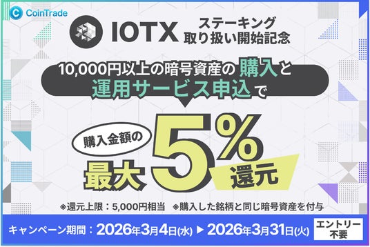 また、「CoinTrade(コイントレード)」はアイオーテックス(IOTX)の国内初となるステーキングサービス取り扱い開始を記念して、キャンペーンを開催いたします。