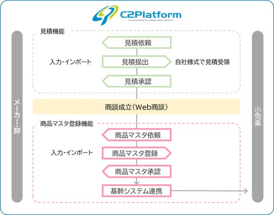 「C2Platform(R)商談支援サービス」は、食品流通業界の商談業務を小売・卸・メーカーが連携することで商談業務のDXを推進し、見積・商品マスタ登録業務を大幅に迅速化・効率化いたします。
