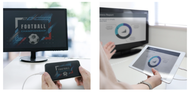 お手持ちのiPhone・iPad と本製品を接続すると、 端末の画面をテレビや外部モニターの大画面でシェアできます。ビジネスシーンでの会議はもちろん、旅行先で撮影した写真や動画を複数人で楽しむといった使い方ができます。