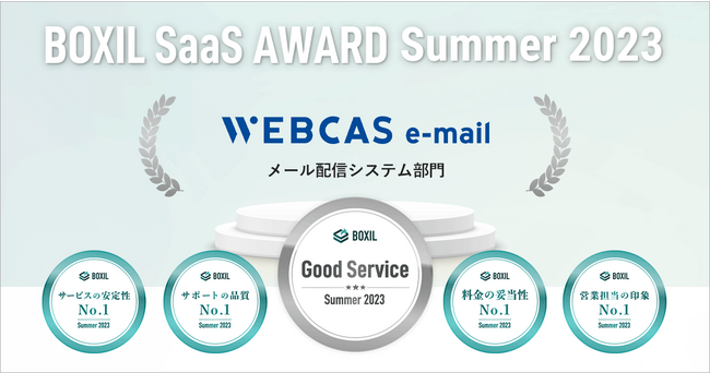 自社開発システム「WEBCAS(ウェブキャス)」と「WOW engage(ワオエンゲージ)」を通して、企業のマーケティングとカスタマーサクセスにおけるコミュニケーションの課題解決を支援する株式会社WOW WORLD(ワオワールド/本社:東京都品川区、代表取締役社長:美濃 和男、以下、当社)は、スマートキャンプ株式会社(以下「スマートキャンプ」)が今最も評価されているSaaS(※)を表彰する「BOXIL SaaS AWARD Summer 2023」のメール配信システム部門において、当社の提供するメール配信システム「WEBCAS e-mail(ウェブキャス イーメール)」が「Good Service」に選出され、同時に「サービスの安定性No.1」「サポートの品質No.1」「料金の妥当性No.1」「営業担当の印象No.1」の4つのNo.1を獲得したことをお知らせいたします。