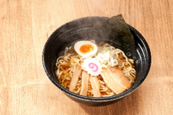 独自製法の半生麺を使用したモチモチの麺と、コクがありあっさりとした醤油スープ、自家製チャーシュー、メンマ付。