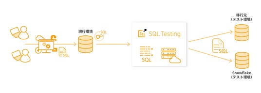 SQLテストの構成イメージ:既存データベースからSQLを収集し、移行元のテスト環境およびSnowflake上でSQLを実行、挙動を比較します。