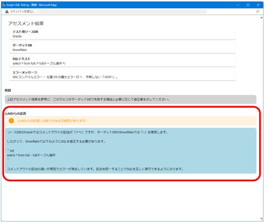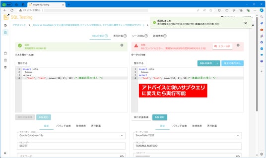 提案されたSQL修正案が正しく動作するかどうか、同じ画面で再度テストを実行することができます。テストが成功すれば、移行アセスメントは完了です。