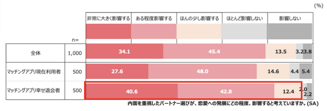 幸せ退会者の95.8%が、価値観など内面を重視したパートナー選びが恋愛への発展に影響すると回答、またアプリ現在利用者と比較し、「非常に大きく影響する」という回答が13ポイントも上回っていることから、幸せ退会者はより、内面重視のパートナー選びが恋愛の発展に影響すると実感していることが伺えます。