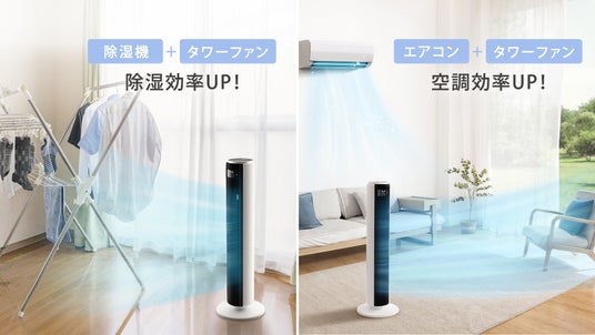 エアコンと併用することで効率的な空気循環を促し、節電効果も期待できます。梅雨時には除湿機と組み合わせることで、洗濯物をより速く乾燥させることもできます。