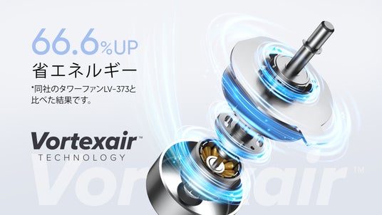 新36インチタワーファンにはDCモーターを搭載し、従来モデルと比べて省エネ性能が約66.6%向上しました。また、独自の特許技術「Vortexair(ヴォーテックスエアー)テクノロジー」により、空気の流れを効率的にコントロールし、部屋全体にやさしい風を届けます。