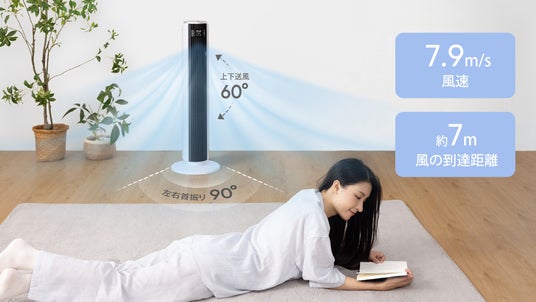 新36インチ タワーファンは、42インチモデルと同等の最大風速約7.9m/sを実現。左右90°、上下60°の広範囲首振り機能を搭載し、部屋の隅々まで心地よい風を届けます。