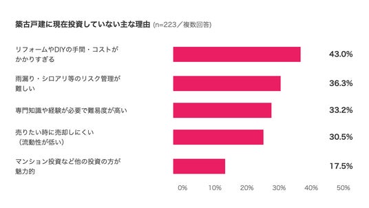 築古戸建に現在投資していない層に理由を尋ねたところ、「リフォームやDIYの手間・コストがかかりすぎる」43.0%が最多となりました。