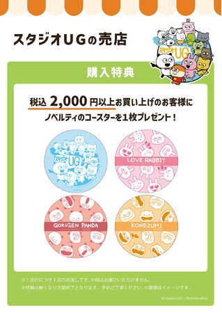にしむらゆうじさんが描く「ごきげんぱんだ」や「こねずみ」などの人気キャラクターが集う期間限定ショップ「スタジオUGの売店」では、イベント限定商品や先行販売商品など、期間限定ショップならではのグッズを種類豊富に取り揃えました。さらに税込2,000円以上お買い上げのお客様には、ノベルティのコースターを1枚プレゼントいたします。