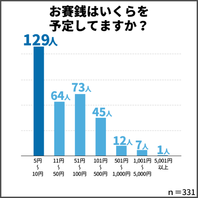 「初詣に行く予定」と回答した331人にお賽銭として予定している金額をお尋ねしたところ、一番多かったのが「5円~10円」でした。