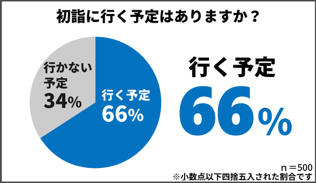 「2023年は初詣に行く予定はありますか?」と伺ったところ、「行く予定」と回答した方は66%でした。予定の時点でこの人数ですから、実際の参拝者はもっと増えるかもしれませんね。