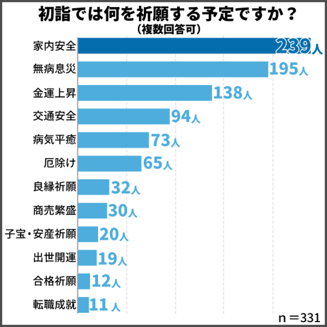 皆さんは初詣で、どんなことを祈願するのでしょうか?回答結果の第1位は「家内安全」で、2位が「無病息災」でした。