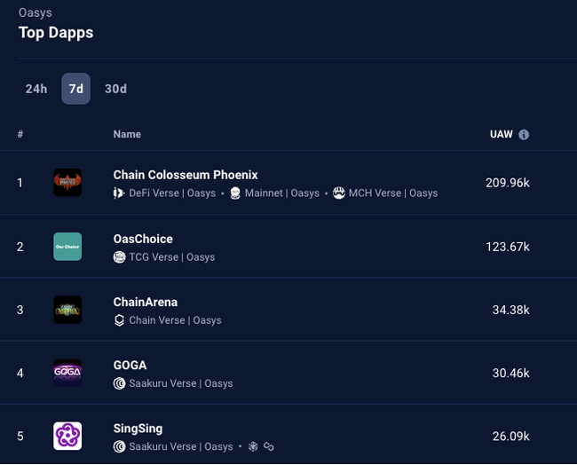 1月11日時点で、Oasysの様々なゲームタイトルが、DappRadarのゲーム部門ランキング(週次)で顕著な成果を達成しております。中でも「Chain Colosseum Phoenix」、「OasChoice」がトップ10にランクインしました。また「SingSing」、「GOGA」、「Chain Arena」も30位以内にランクインし、Oasysプラットフォームの多様なゲームラインナップの強さを示しています。