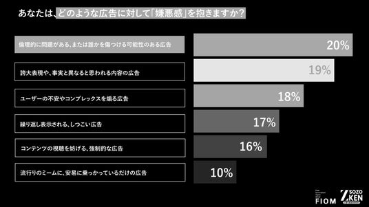 どのような広告に嫌悪感を抱くかという問いには、「倫理的に問題がある、または誰かを傷つける可能性のある広告」(20%) と 、「誇大表現や、事実と異なると思われる内容の広告」(19%) が上位に挙がりました 。「ユーザーの不安やコンプレックスを煽る広告」(18%) にも強い拒否感を示しており 、企業には高い倫理観と情報の透明性が求められています。